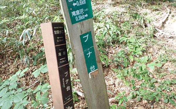 湿度高く、朝から蒸し暑い杉林を過ぎ、ミズナラの巨木の森を抜けて6時40分ごろブナ台へ。