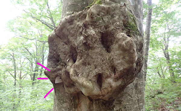 ブナと書かれたプレートを飲み込みつつあるブナ。