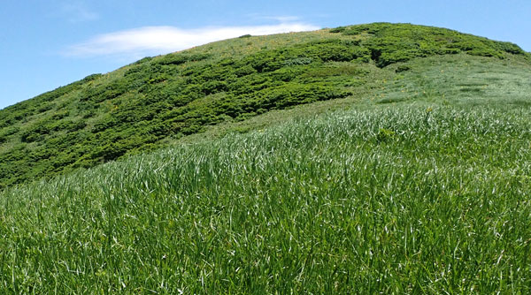 草が被っている箇所もあるので慎重に進み、急登を登りきれば斜度が緩んで薬師岳の肩に乗る。