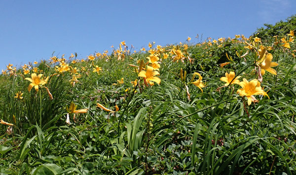 ここのニッコウキスゲが終盤ということは、山頂はちょうどいいかもと、ガイドの心はすでに和賀岳に向いてしまったのだが、初めて訪れる薬師岳のニッコウキスゲに、お客さんたちは盛り上がっていた。