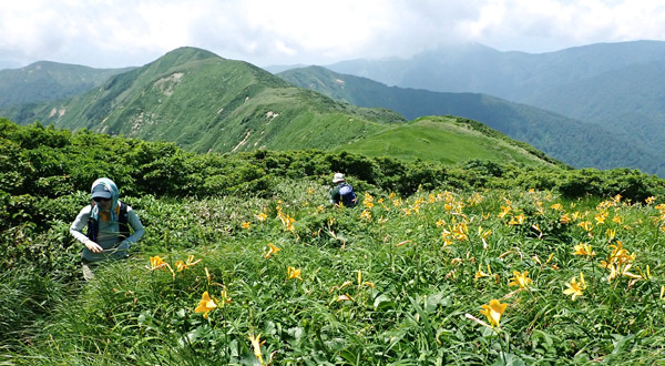 ここまでの稜線と、ニッコウキスゲと、和賀岳山頂などよりニッコウキスゲに夢中な我々。