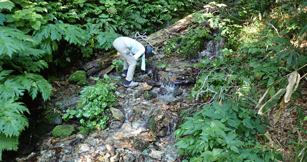 湧き出たばかりの沢水は、白く冷気がたちのぼり周囲はひんやりとして気持ちがいい。
