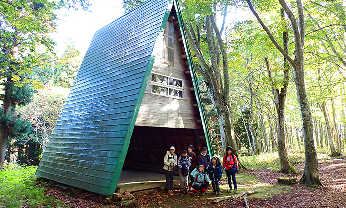 早くもはじまるブナの美林のなかを、10分ほどゆるく登ればお馴染みの緑の三角屋根。