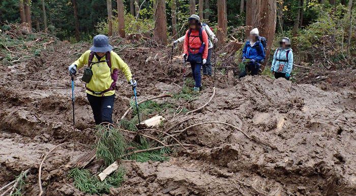 数日前の先行者が敷いたらしい杉の枝を踏むも、沈むので周辺にあった木切れを敷いてドロドロゾーンを渡り切る。
