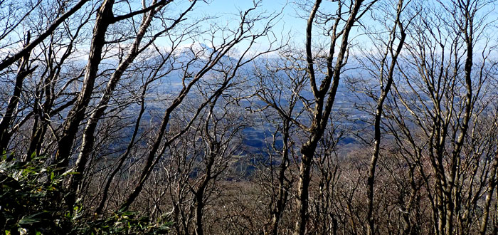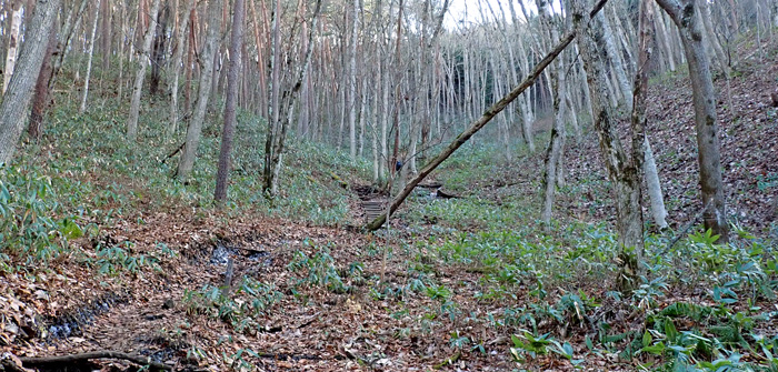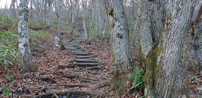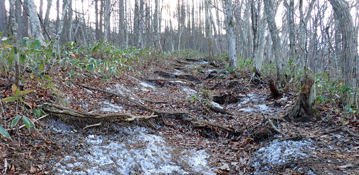 標高的には、日本海側ならばブナが優勢になるころだが、ミズナラなどの混成林が続くところに太平洋側であることを感じる。