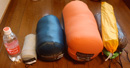 横のグレーがシーツで、オレンジ色のが冬用シュラフ。その横はテント一式の収納サイズ。