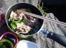 持ち手が折り畳めるものがベスト。材質はチタンが軽くていいが割高。 このままガスにも掛けられるので、少量調理する際には手っ取り早くていい。 写真ではただの皿代わり。