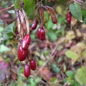 枯れた花の先に深紅の実が着く。食べられるようだが、さほど美味しいわけでもないようだ。果実酒にすると滋養強壮に良いと言われる。