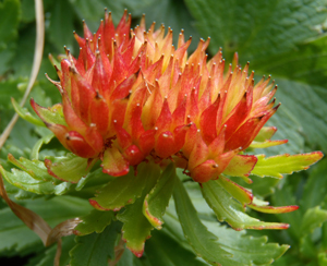 華やかではないもののそれなりにかわいらしい花なのだが「弁慶」というゴツい名前を持つ。由来はその強靭な生命力にあるようで、枝や茎を切っても簡単には枯れないのだそうだ。 その強さから弁慶の名が付けられた。生えている場所は風当たりの強い岩礫地。過酷な状況下で生き抜くタフな花なのだ。雌株と雄株に別れていて、写真の赤い方が雌。受精すると子房が赤くなる。受精前は黄緑。もう一方が雄。ホソバイワベンケイは名前の通り葉が細い。丸っこい葉であればイワベンケイ