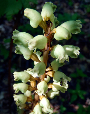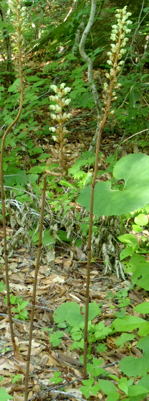高さ1mにもなる大きなランだ。マイナーな山道など歩いているとときどき、登山道の脇や下手すれば真ん中にのっそりと突っ立っている。葉はない。光合成はしない。ナラタケ属の菌に寄生してそこから養分をもらってここまでデカく育つのだ。こんなデカいランに寄生されたら堪ったもんじゃないだろうと心配するのは早計だ。ナラタケは史上最大の生物と言われ、地表に出ているキノコは彼らのごく一部。本体は菌糸として森の地中に張り巡らされ、その範囲たるや15haにも及んだという報告もある。このランの漢字表記は「鬼の矢柄」。鬼が持っている矢に例えられているとのこと。