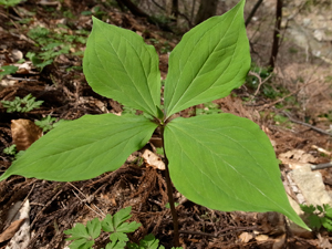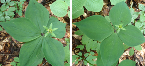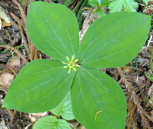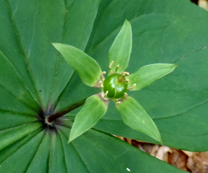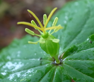 5枚葉のもの。花が終わり実が付いている。実が黒く熟し、萼が下がると
