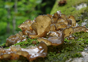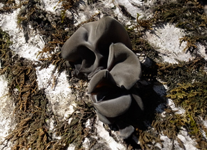 春から秋、広葉樹の枯れ木に生える。これは黒いのでアラゲキクラゲのほうかも。表面が細かい毛で覆われている。どっちにしろ食べられる。