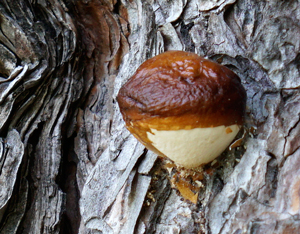 2016年5月29日 秋田県 真人山 春から秋、枯れた松の木に生える。2〜5センチほどの、一口饅頭のような形。枯れて二年目の松に生えるとのこと。
