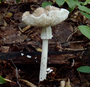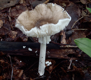 夏から秋、コナラとクヌギ林やアカマツとコナラ林などに生える。写真はだいぶ古くなっていて傘が反り返ってしまった。毒きのこ。ひだは白。