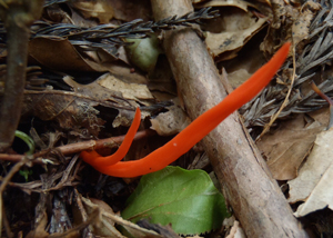 カエンタかベニナギナタタケか見分けがつきにくいのですが、ひょろっとした形と濃いめの朱でベニナギナタタケとしました。カエンタケは猛毒で触っただけでも火傷のような症状になり、食べると30分ほどで症状が出て死ぬ確率が高い。一方こちらは食べられる。だが、その猛毒のそっくりさんと見分けがつきにくいのと、食べてもさほどうまいわけでもないので手を出さない。