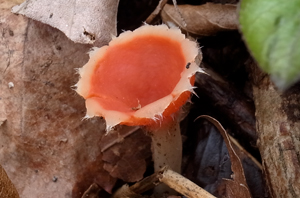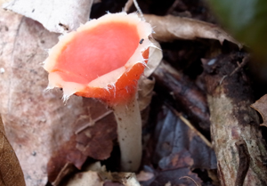 赤いカップは1センチほどの小さいきのこ。幼いうちは全体に丸っこいが、徐々に盃が開いていく。