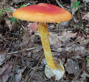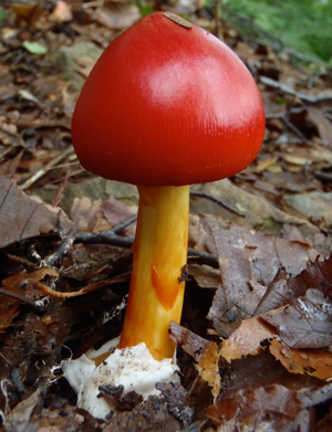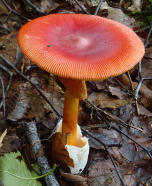 夏から秋、広葉樹や針葉樹林に生える。派手なきのこだが食べられる。