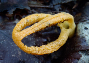 夏から秋に林や道端などに生える。写真のは黄色いが赤っぽいものもある。内側にある黒い液体はクレバ。