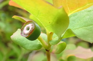花が落ちたあと。これから実が膨らんで黒く成熟していく。