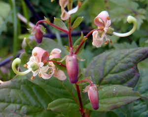 花びらが3枚、後ろへくるんと強く反り返って丸まる。突き出た雌しべまでもがくるんと丸まるのがミヤマホツツジ。亜高山から高山帯に生えていて高さが30〜50センチほど。良く似たホツツジはもう少し標高の低いところに生えていて、雌しべはまっすぐに伸びる。