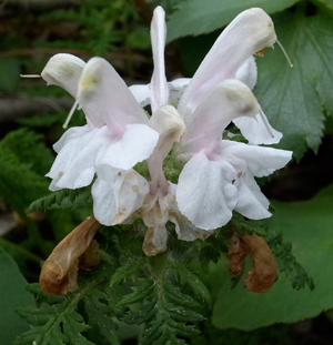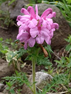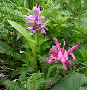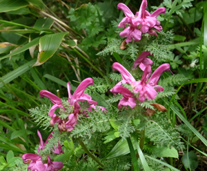 明るいくっきりとした紅色の花と、細かく切れ込んだ葉っぱがワサワサとしてゴージャス感がある。花は茎の上部にこんもりと集中して咲く。見た目も名前も似た花のヨツバシオガマの方は、葉っぱがもう少しあっさりとしていて、茎を中心に4〜5個くるりと輪生しており、ミヤマさんとの明確な違いとなっている。