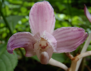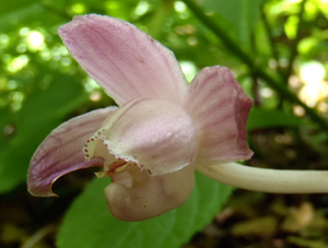 葉緑素を持たず、菌類に寄生して栄養を得る腐生植物。主に日本海側、亜高山帯に生えている。腐生植物といえば、ギンリョウソウやオニノヤガラなど地味な花がほとんどだが、ショウキランは珍しくピンク色だ。