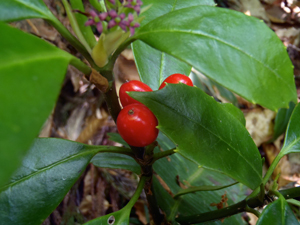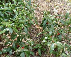 去年できた実と、つぼみを持つ雄花の株。実は一年かけて赤く熟す。