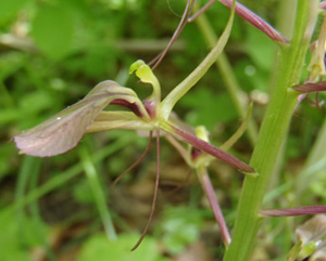 側萼片は黄緑色で糸状。側花弁は薄いピンクで細い糸状。唇片が幅広く、これが鈴虫の雄の羽に似ていることが名前の由来となっている。花の時期は5〜6月。