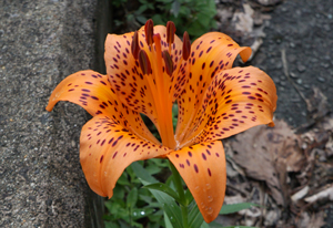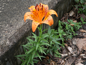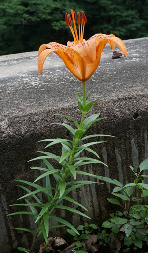 本家のスカシユリは海岸の砂礫地に生えるが、こちらは名前の通り山に生える。名前の由来は花びらがその付根で細くなり、隙間があることによる。