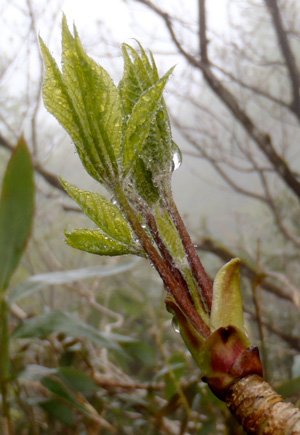 4〜5月、新芽の部分を摘む。タラノキもそうだが、こうした新芽は脇芽を採って先頭部分は採らないように 気をつけたい。全部採ってしまうと木は死んでしまう。枝ごと採って来てバケツに差して新芽が出るのを待つようなアホな輩もいるそうだ。 自然の恵みを分けていただく謙虚さが欲しい。