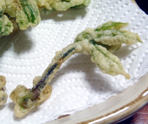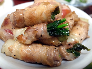 右の料理は、豚バラ肉巻きにしたもの。 豚バラ肉に、コシアブラを数本まとめて巻いて、フライパンで炒める。味付けは塩こしょうでもいいし、うどんつゆなどを少量回しかけて蒸し焼きにしても美味しい。