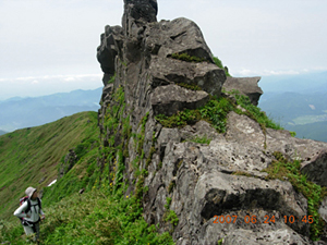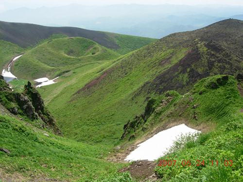 女岳の噴火跡を過ぎて男岳へ振り返ると和賀岳、羽後朝日岳が青く整列し、鳥海山は雲の中。遠くには