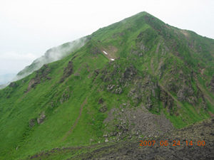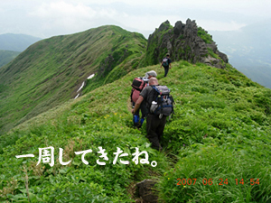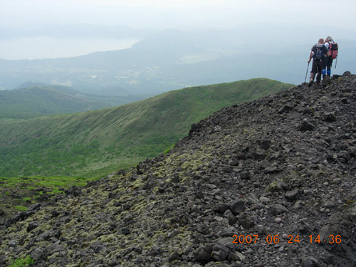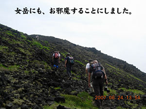 締くくりは女岳の噴火口ほどなくして女岳の溶岩あとが見えてくると、どうやら山頂へ行けるらしいことが判明。 時間も余裕があるので、 寄ってみることにしました。 溶岩だらけのやたら軽い石ころはフカフカの苔にところどころを被われて じゅうたんのように柔らか。山頂は訪れる人もなく、やたらとストイックな「メダケ」の標識が 我々を迎えます。 いまだに水蒸気が弱々しく数カ所から湧いておりいかにも火山らしい光景。 女岳を下りて尾根へ登ると五百羅漢の岩はすぐです。 |