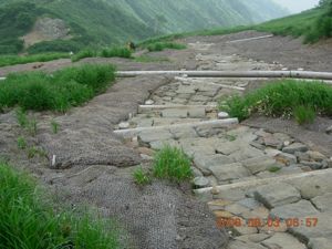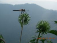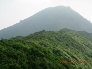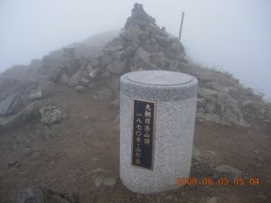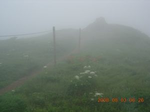 わずかな望みをかけて山頂へ朝4時に起床。外は相変わらずガスってる。まだ暗いけど山頂を目指して4時30分ごろ空身にカメラだけ持って出発。20分ぐらいで山頂に。山頂は風が強い。時折ガスが風に払われる瞬間があり、その隙間からピンク色の朝焼けがのぞく。なおも待っているとかなりガスが飛ばされた瞬間があり、すぐ足下にうねる大きな雲海と朝焼けの静かな凪のような空が広がった。その一瞬の美しさはかえって怖いくらい大きかった。 |