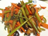 ごま油で材料を炒めて、しょうゆ、砂糖、日本酒を各大さじ1ぐらいで