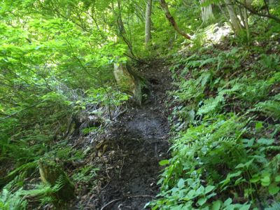 登山道は地形図通りほぼ直登。湿った粘土は滑りやすく