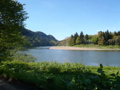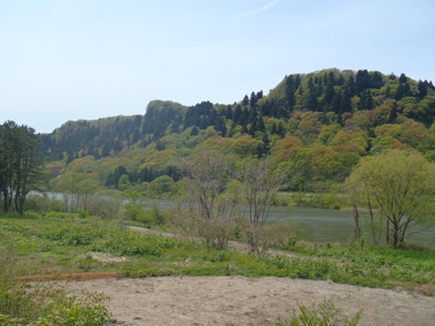 ここから米代川と、水を張ったばかりの田んぼの眺めがよろしい。