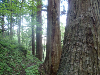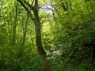 見上げると、気持ちいいくらいにまっすぐな大木が、新緑に光っていた。