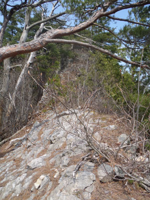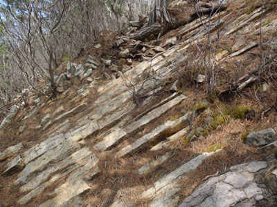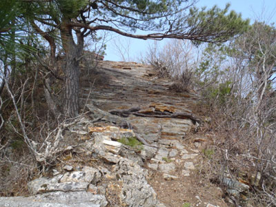 山頂を作る巨岩の崩れそうなヘリを巻いて進むと
