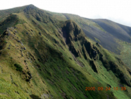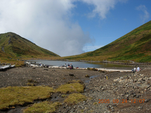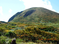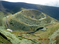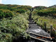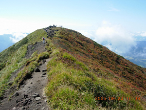 さすがファミリー登山のメッカ(?)だけあって、あっというまに阿弥陀池。 登山道は段差が大きくてちょっと歩きにくいものの、超楽勝。普通に街にいるような人たちがいるし、子供も駆け回っている。ここ最近、地味めな山ばかりだったのでこの賑やかさに軽くショックを感じてしまう。 まずは岩だらけの男岳に取りかかる。 20分ぐらいで登れるようだ。途中で小岳の火口が良く見えた。高校の登山教室で何故これを見てないんだろ?記憶しているのは避難小屋のトイレの凄さだけだし・・・。