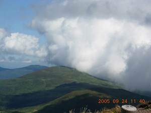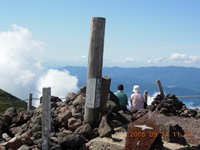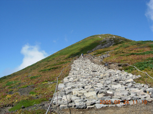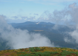 次に目指すは最高峰の女目岳。青空に紅葉が映えるとともに、頂上まで続く階段と植物保護の柵が痛々しい。 秋田に山頂がある山では一番高い山がここ女目岳。そんな名誉ある山なのに階段で登るなんて、複雑な心境。 山頂からは遠くに大白森の不思議なくらい平坦な山頂が黄色く染まってるのが見える。 森吉山の端麗な姿もくっきり。 やや雲が出てきて、湯森山はどど〜んと雲に喰われそうになっている。