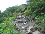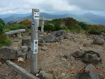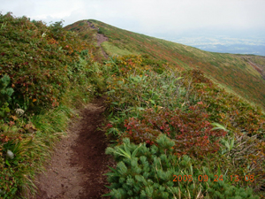 阿弥陀池のほとりで昼食を食べ、避難小屋脇を通って横岳を目指す。晴れているものの時折ガスが飛んできて昼食中は結構寒かった。防寒着は必須です。 横岳へは急な歩きにくい登山道をしばらく登る。稜線に出てしまうと両側に絶景を従えての気分のいい散歩道です。13時15分ごろには横岳に到着。 ここから湯森山方面と横長根を国見温泉まで続く道が分かれている。 横長根(横尾根)の道があまりに気持ちよさそうで後ろ髪引かれながら予定していた湯森山方面へ進んだ。