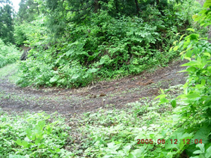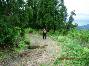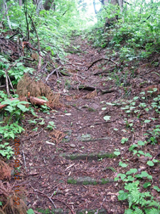 苔むした古い石段があらわれると、 さすが信仰の山の趣きが増してきます。 ※左写真の段々は石段です。 などと、まったりしてると 横にそれる小道がある。 踏み入ると視界が開け、 なんと、ば〜んと林道が 登山道のすぐ横に接近して また遠のいてました。