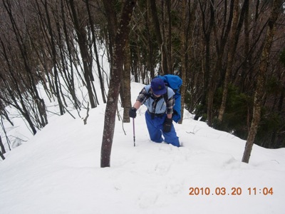 ・・・そのT中さん、ときおりズボッと雪を踏み抜き悪戦苦闘の様子。