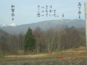 本日は渋く高下岳を狙う二日連続の晴天となった土日。雪の季節となり一人で行ける範囲も限られてくるなか、岩手県沢内村から登る高下岳に 目が止まった。高畑口という登山口が02年ごろ開かれており、ここが高下岳への最短ルートらしい。登山道も広い 尾根につけられていてとても明るく、アプローチも容易、との情報を入手し、「いいんじゃないの」と急きょ決定。 高畑口は岩手県の県道1号線を大荒沢川沿いの林道を3.5キロ入ったところにある。地図を見るとやたらまっすぐな林道 だ。途中から本日登る高下岳とその お隣さんの和賀岳が出迎えてくれて感動。 |