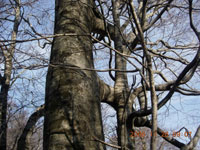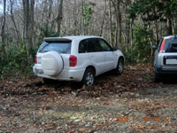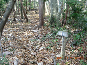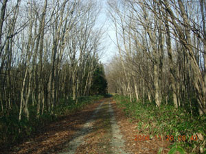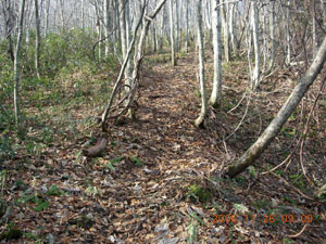 9時00分登山開始!林道の終わる手前が登山道入り口。このすぐ奥が林道の終点で車が5〜7台ほどとめられるスペースがある。 駐車しているクルマは一台きりだ。標高500メートルくらいらしいが、登山道はとにかく明るい。 歌い出したくなる程の開放感がある。落ち葉が地面を埋めていたが、登山道が分かりにくいようなことは ない。登りはじめは山ぶどうの木などもいくつか生えている。 |