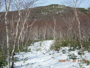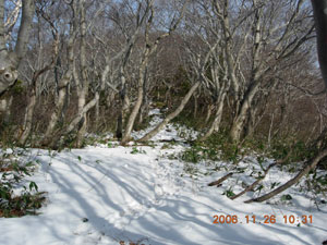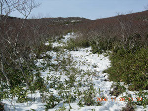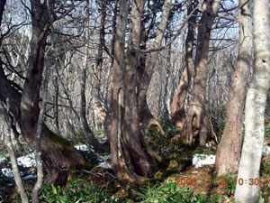 ブナが小さくなって視界が開けたどんどん雪が出てくると、先に登っているパーティが3人以上だということが 足跡から分かった。時折、女性の張りのある声が届くようになる。雪の白さと青空と 白いブナの木々がきれい。木々の向こうに時々、早池峰山の白い頂と隣の薬師岳の端正な 三角形がくっきりと見えた。そして南側の山あいには雲海が見えかくれした。 ネットでいろいろ調べているとどうやら、このへんはスキー登山にもいいみたい。 個人的には「なべっこ遠足」にいいなと思う。 |