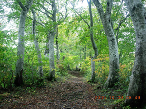 8時20分:大清水避難小屋出発百宅口は比較的マイナーというイメージがあった。なるほど登山口までのアプローチの林道は未舗装。しかし和賀薬師岳のアプローチに比べたらそんなに悪くはない。やがて広い駐車場へ。クルマも数台がちらほら。しかし!登山口へ向ってすぐの大清水避難小屋には驚いた!二棟もぴかぴかの綺麗な小屋があり、キャンプ場は屋根付きの炊事場あり、綺麗なトイレあり、芝生ありの美しさ! 登山道は登り始めは木の根があって歩きにくいものの、やがて、広い気持ちのいいブナの森歩きになる。想像以上の癒し系登山道だ。 |