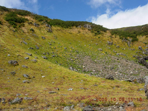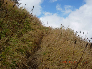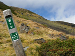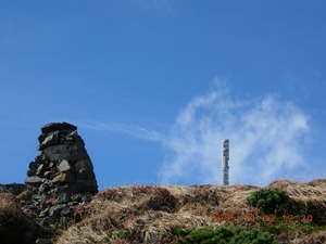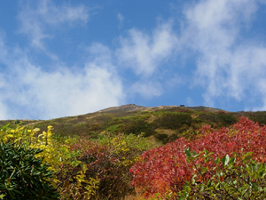 唐獅子を過ぎて人の声が聞こえてきた。周囲に繁っていた熊笹もなくなり草紅葉が広がる。 霧ガ平でようやく人の姿を見た。東京から来て昨日は大清水でテント泊したという女性グループだ。 9合目を過ぎると、天気予報通りの晴れ。なんといってもやっぱりスカッと晴れた気持ち良さは何ものにも勝ると実感する。