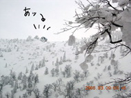 <行く手に避難小屋。石森から避難小屋までのコースにはスキー場の人が竹竿を差してくれていた>